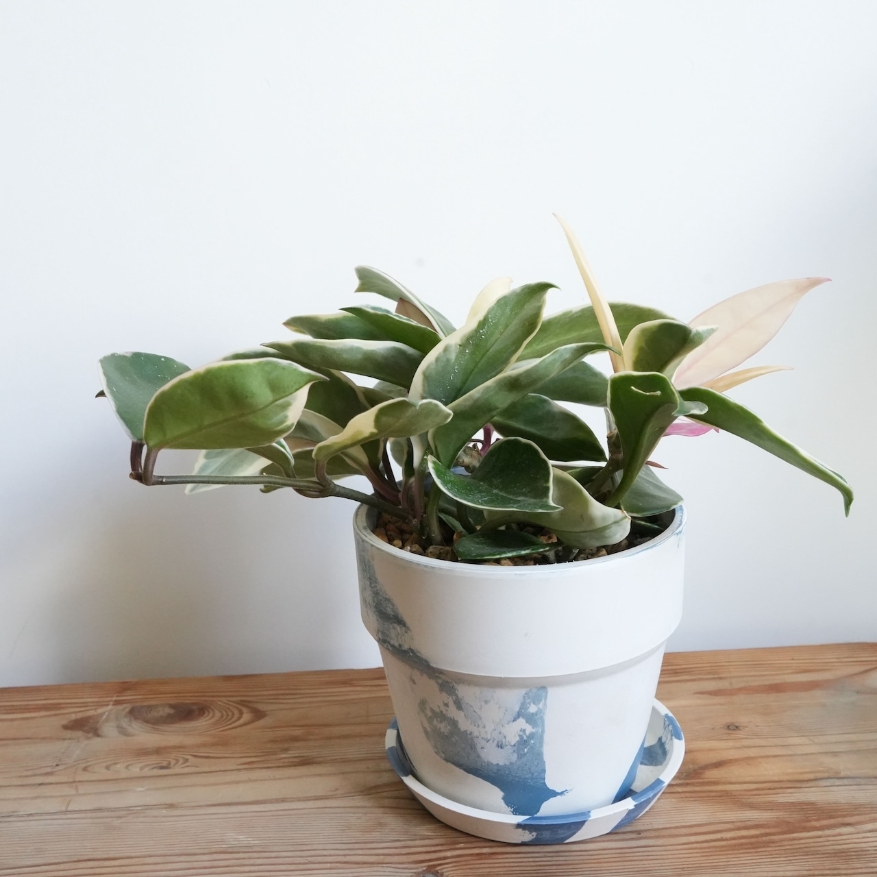 ご用意した「ホヤ カルノーサ リップカラー 」は、ボリュームたっぷりの元気株。淡いピンク色や白色の葉のコントラストもとても美しく、お部屋を爽やかに彩ってくれます。