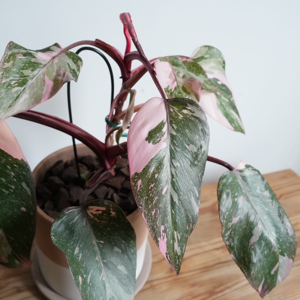 フィロデンドロン ピンクプリンセスは、ピンク斑が散りばめられた葉が美しい品種です。葉の1枚1枚に違った模様が出るので、その子にしかない個性を楽しんでいただけます。次はどのような葉が出るかな?と楽しみに育てていただけます。