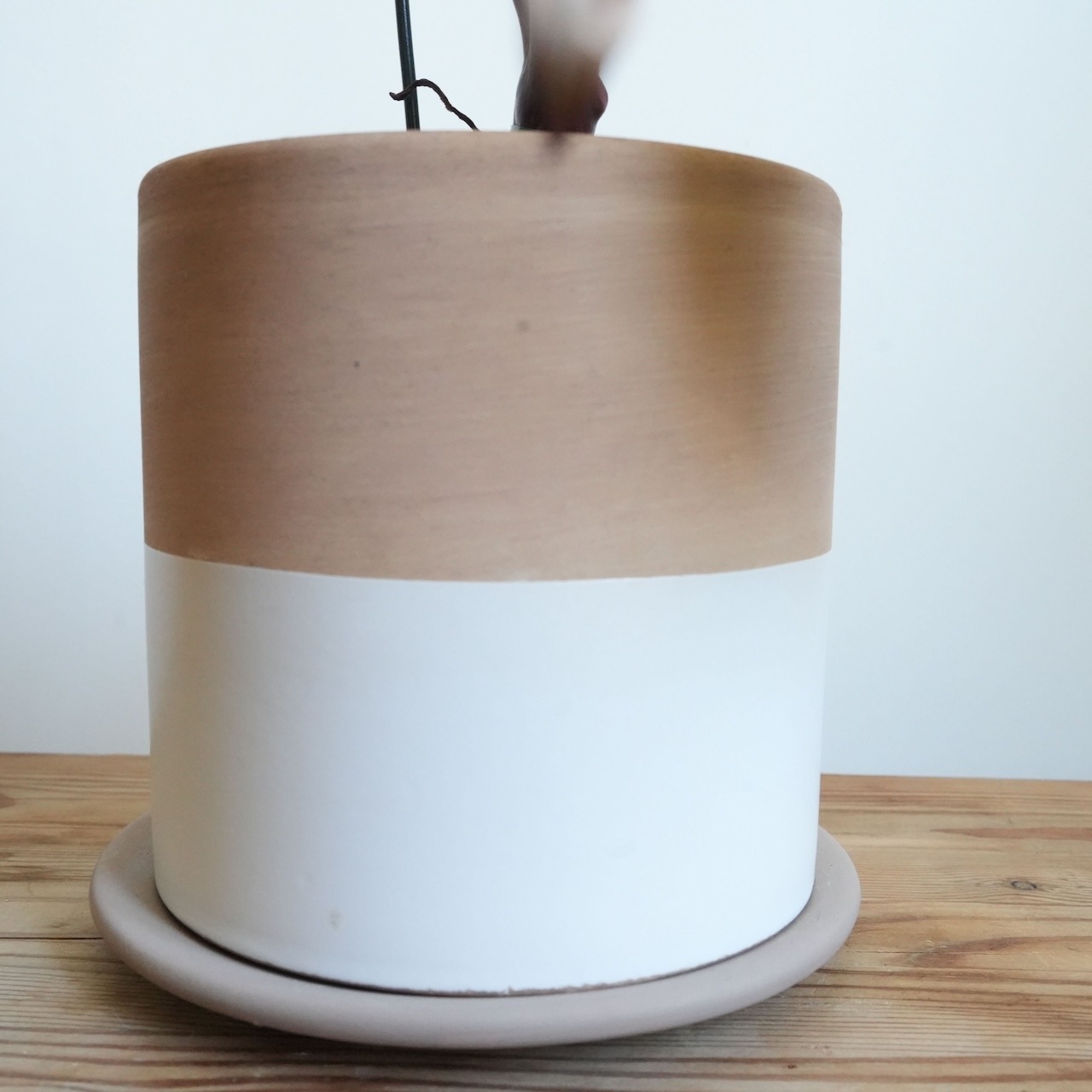 ベージュとホワイトがツートンカラーになった陶器鉢に植え込み、土の上に茶色の化粧石を敷いて仕上げました。