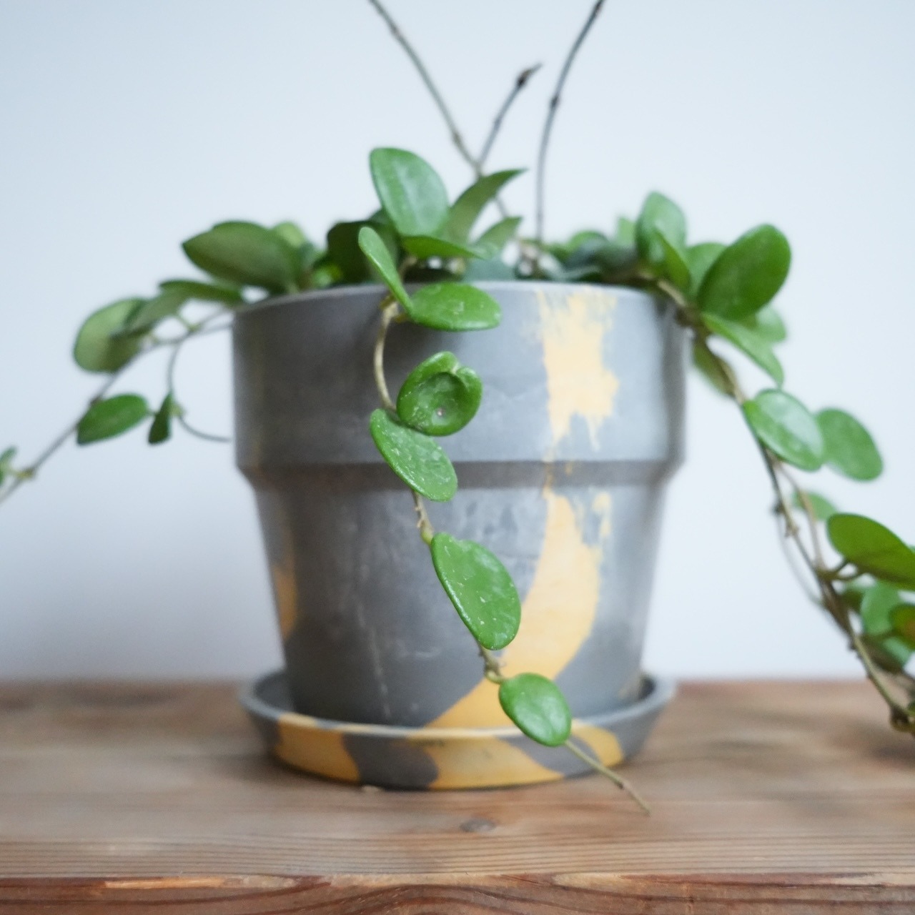リサイクル材を使用して作られたアーバンプランツポットという鉢に植え込みました。プラスチックの鉢になりますがマットな素材で厚みがあり、雰囲気のある素敵な鉢です。(こちらの鉢はグレーとイエローのマーブルカラーに植え込んでいます)