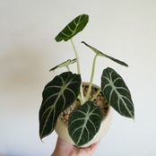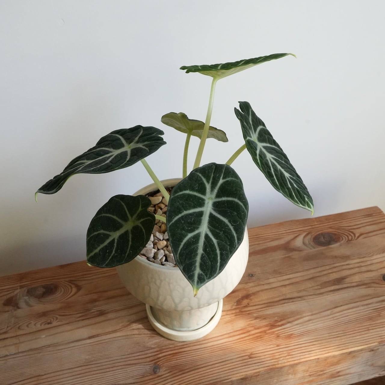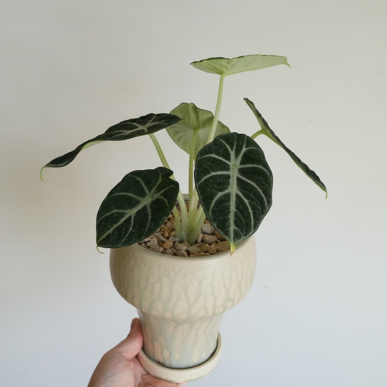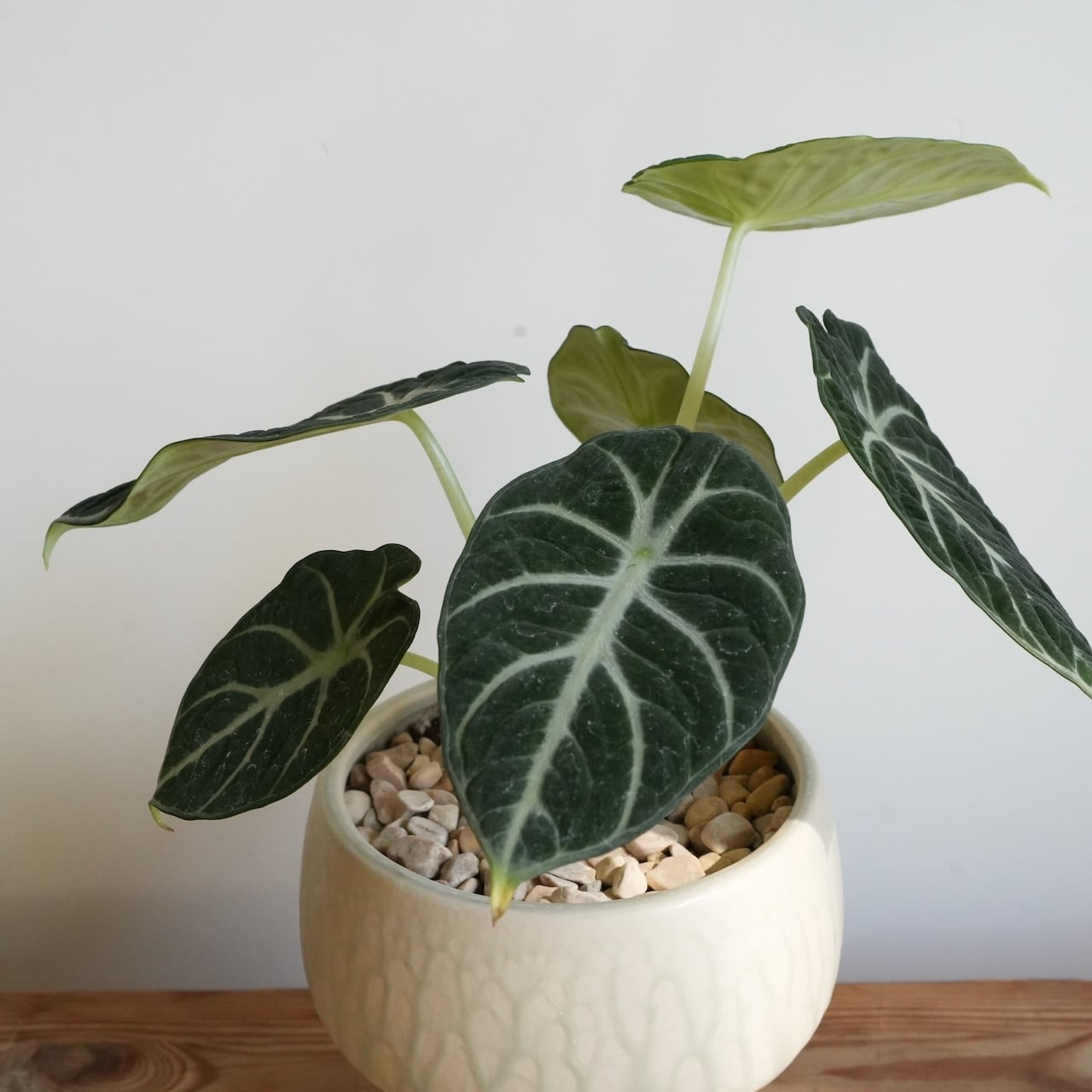 アロカシアは熱帯アジアからオーストラリアにかけて65種類ほどが自生しています。品種によって大きく異なる個性的な葉が魅力の植物で、ニンジャは黒に近いグリーンの葉に白い葉脈、ベルベットのような質感が特徴の品種です。アロカシアの中では丸葉の小型で可愛らしい印象もあります。