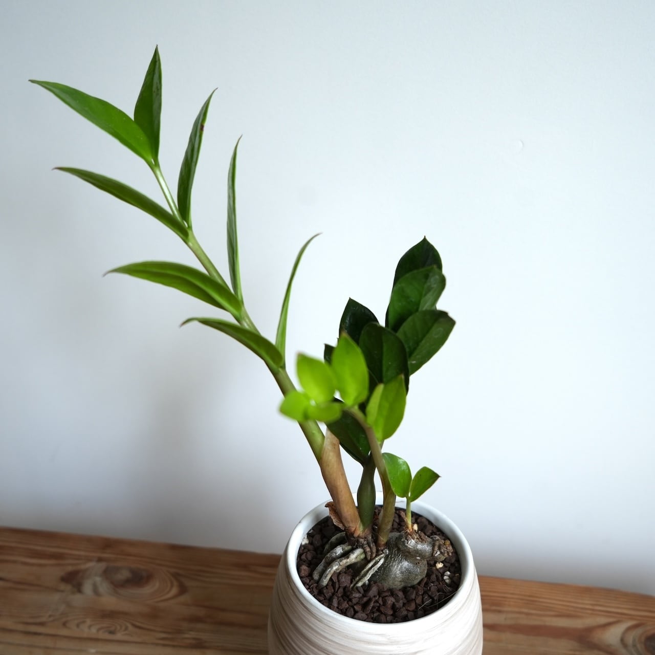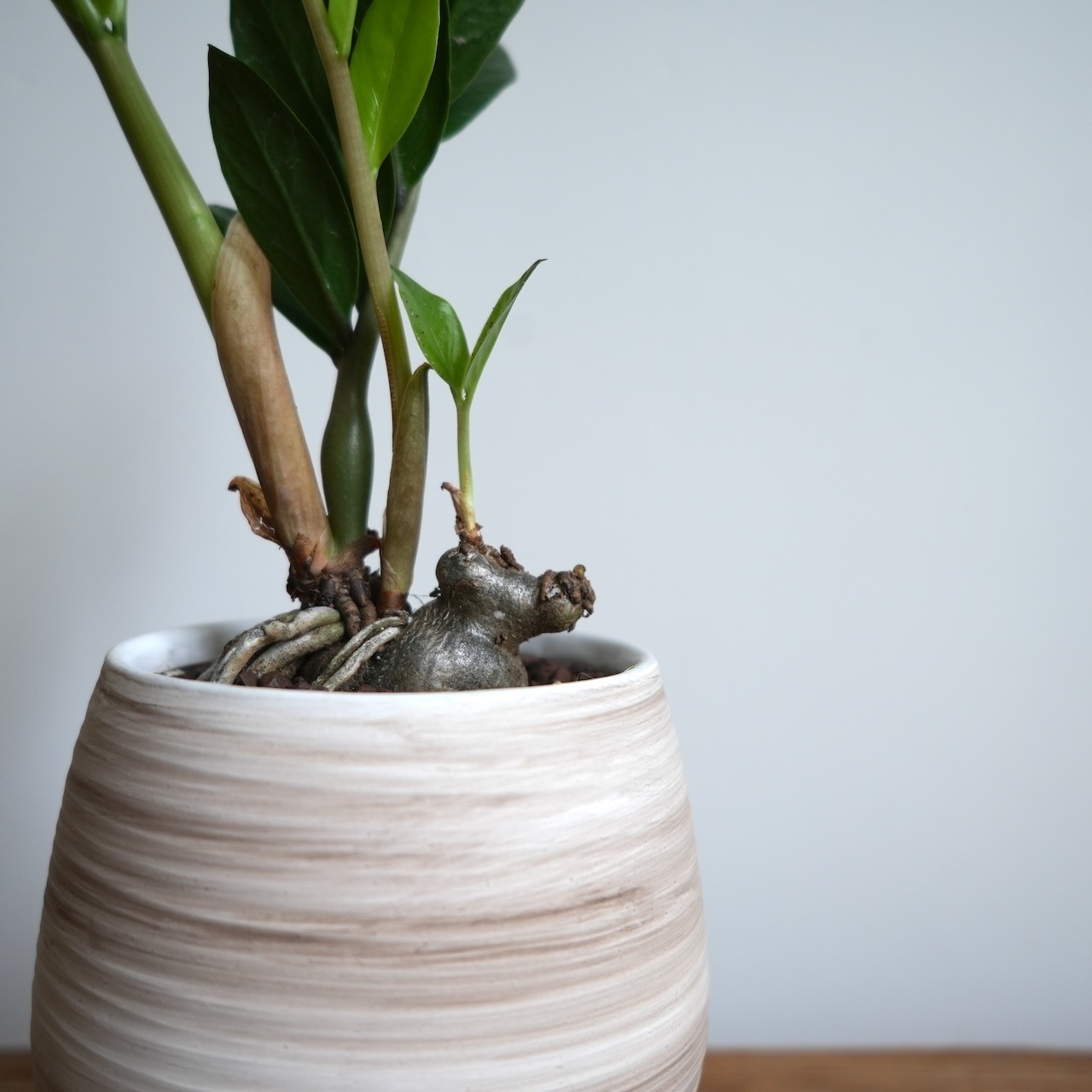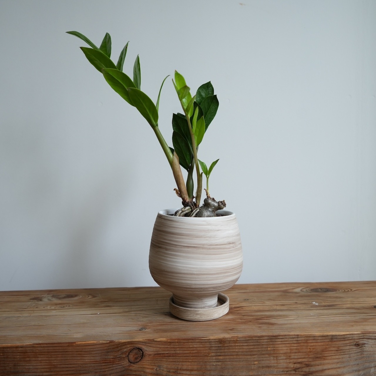 ご用意した「ザミオクルカス」は芋の部分と根が土の上に出た珍しい根上がり仕立てタイプ。通常のザミオクルカスも逞しく力強い印象ですが、この子はさらに野生的な雰囲気を醸し出しています。小ぶりなサイズですが圧倒的存在感でお部屋の主役になってくれます。