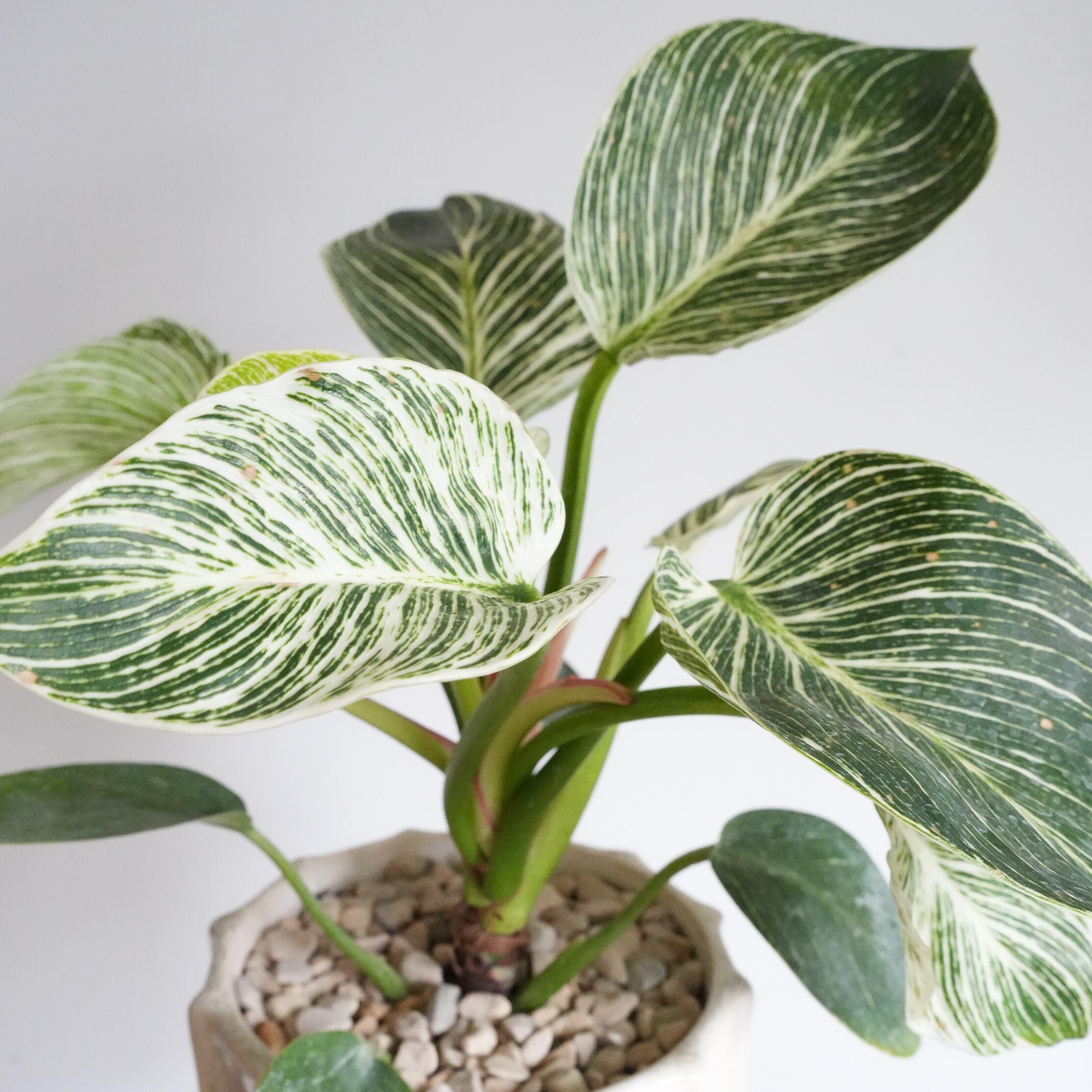 大きな葉と根元から立ち上がる姿が美しいフィロデンドロン。バーキンは白い新葉と次第に深い緑に変化していく葉とのコントラストが美しい品種です。まさに‘バーキン’の名にふさわしいエレガンスな雰囲気を纏っています。