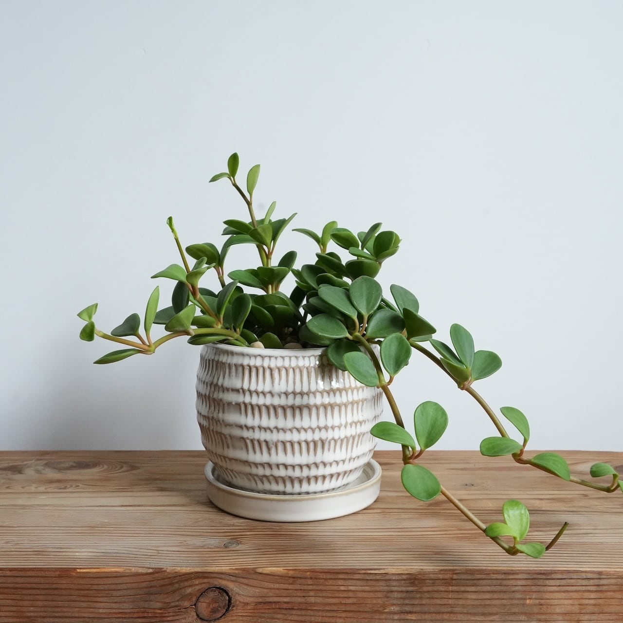 ご用意した「ペペロミア ホープ」はボリュームたっぷり、あちこちに伸ばしたツルがなんとも愛らしいひと鉢。ゆっくりと成長していくので、変わりゆく姿を楽しみにじっくりと育ててあげてくださいね♪