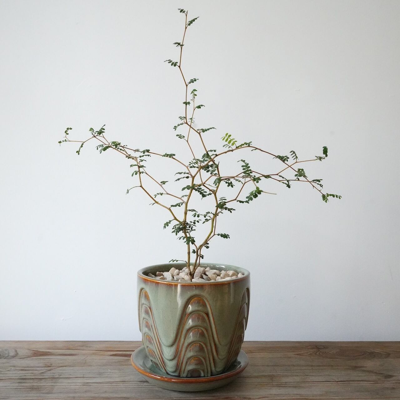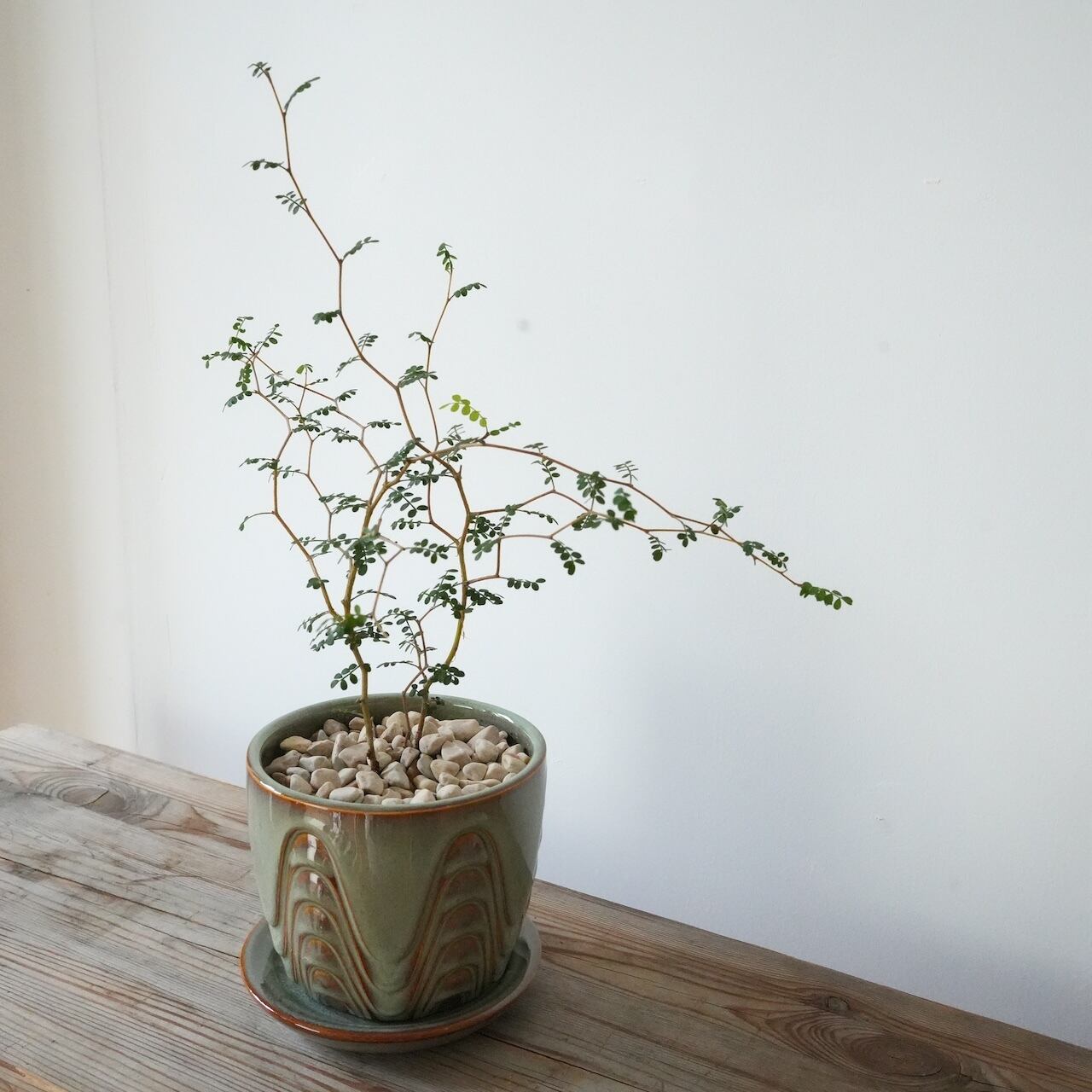 ミルキーなグリーンに飴色の波打ったデザインが特徴的な陶器鉢に植え込み、土の上に白色の化粧石を敷いて仕上げました。
