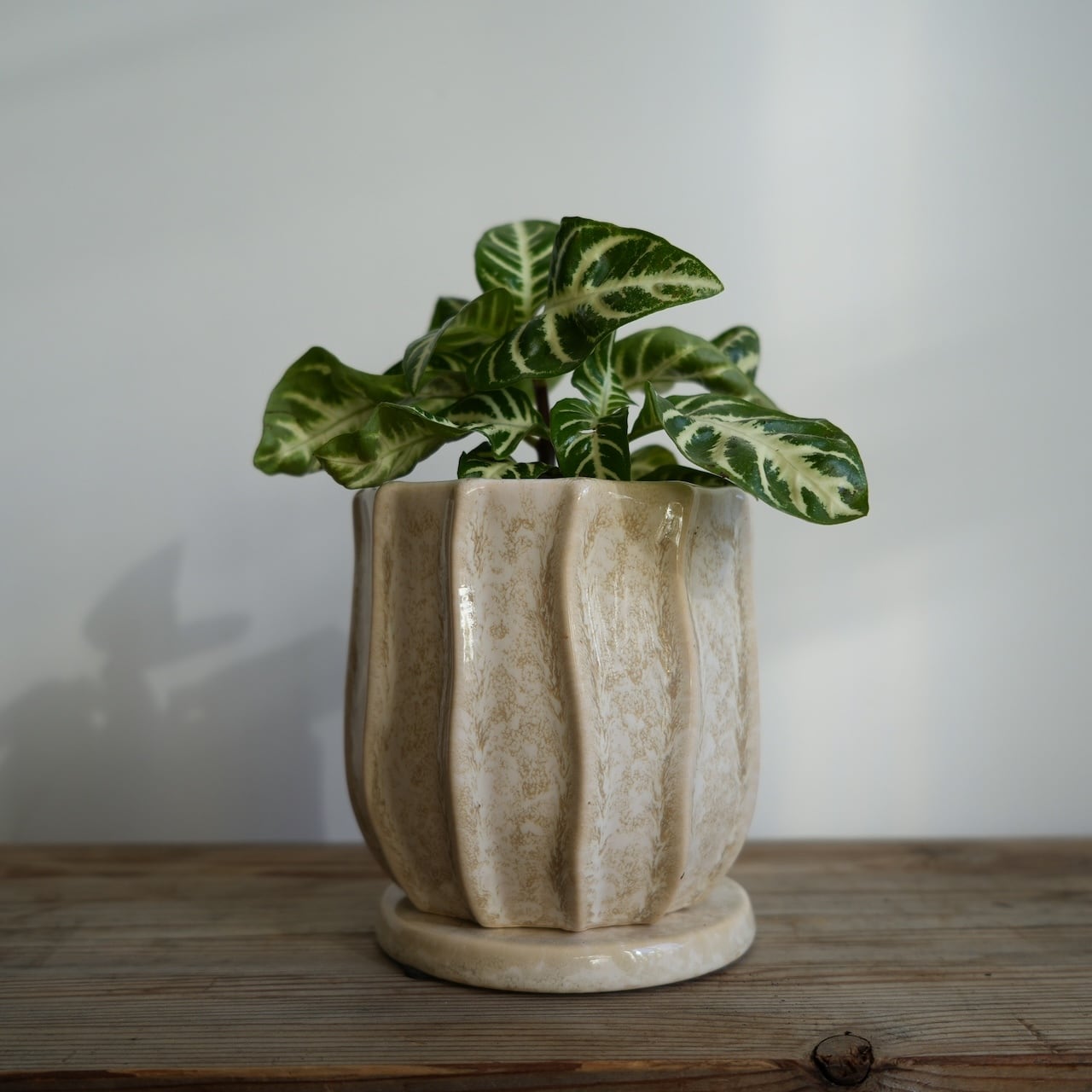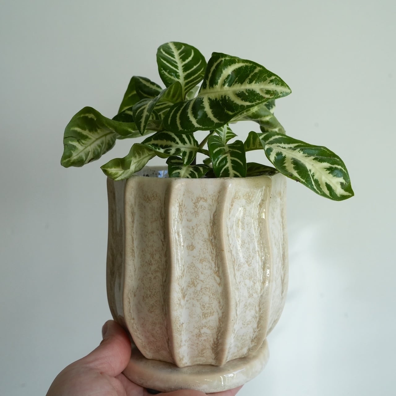 ご用意した「カーリーホワイト」はコンパクトなサイズながら、葉がバランス良く展開されており、うっとりするほど美しい草姿です。葉色の濃淡が激しいですが、葉の質感が柔らかい印象なのでインテリアや他の植物たちとも、上手に馴染んでくれます。