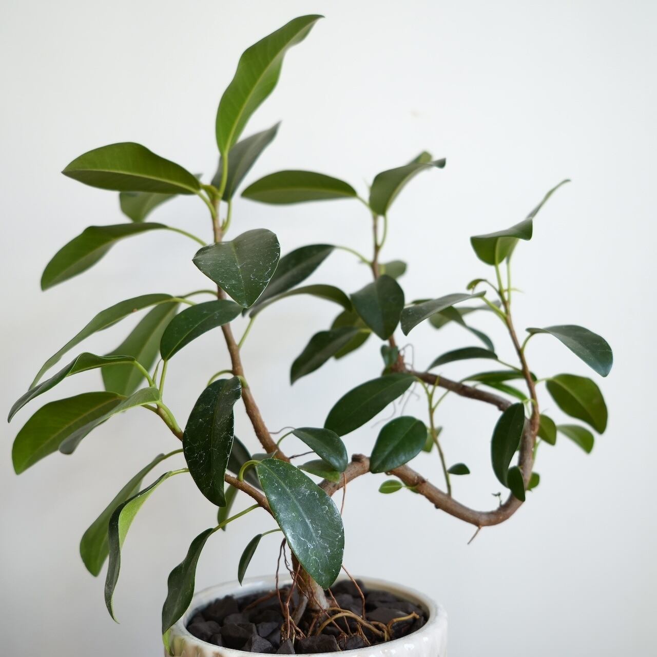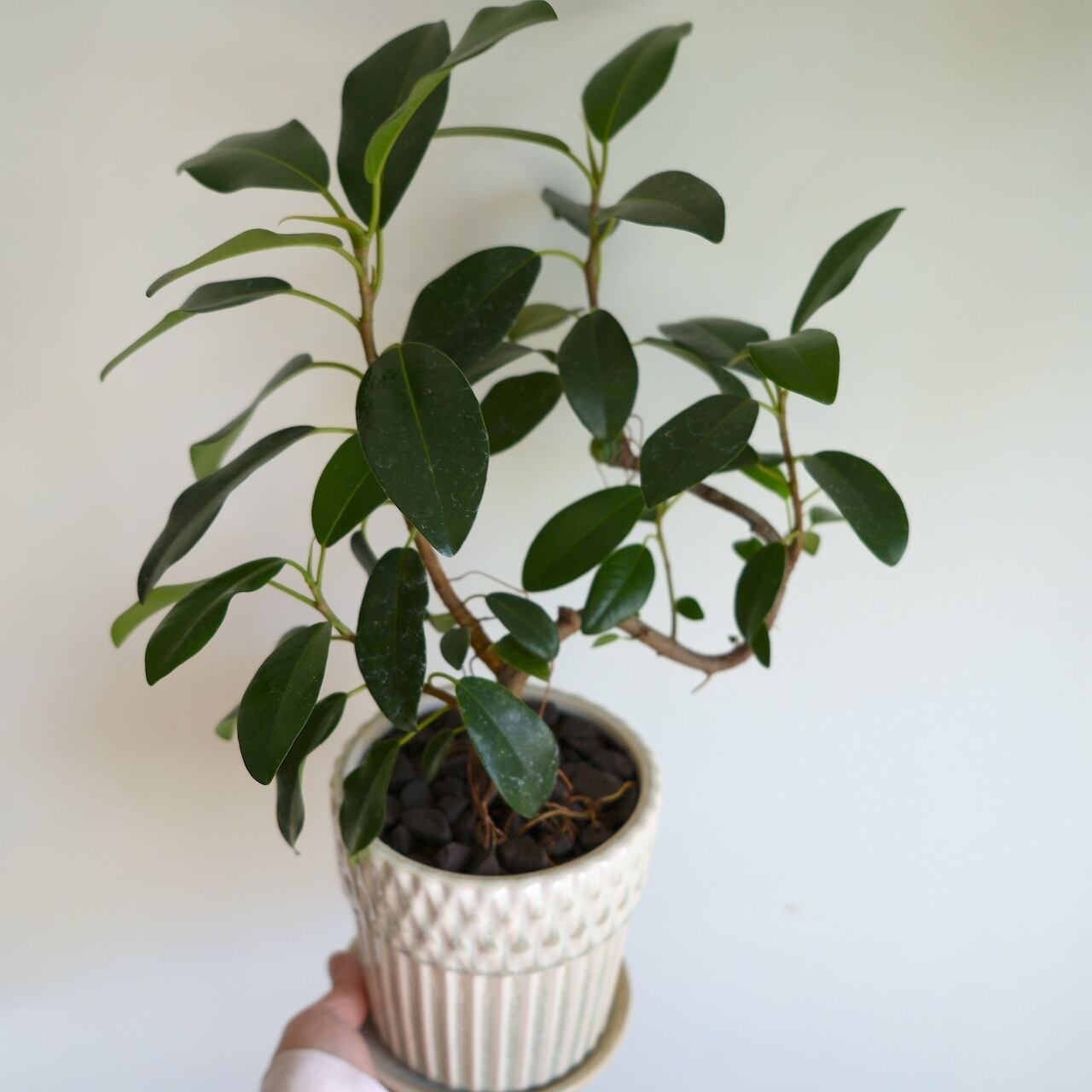 ご用意した「フランスゴムの木」はバランス良く4方向に伸ばした樹形が面白い曲がり仕立てタイプです。幹から伸びている気根も野生み溢れワイルドで◎しっかりと存在感を感じていただけるひと鉢となっています。