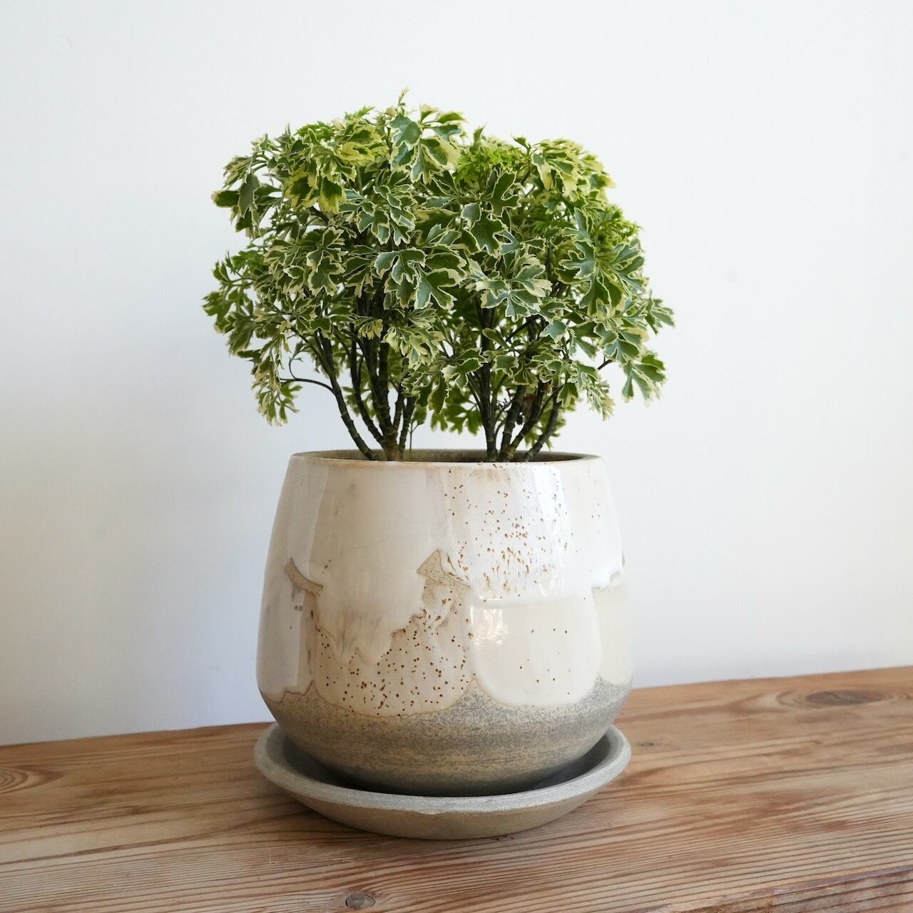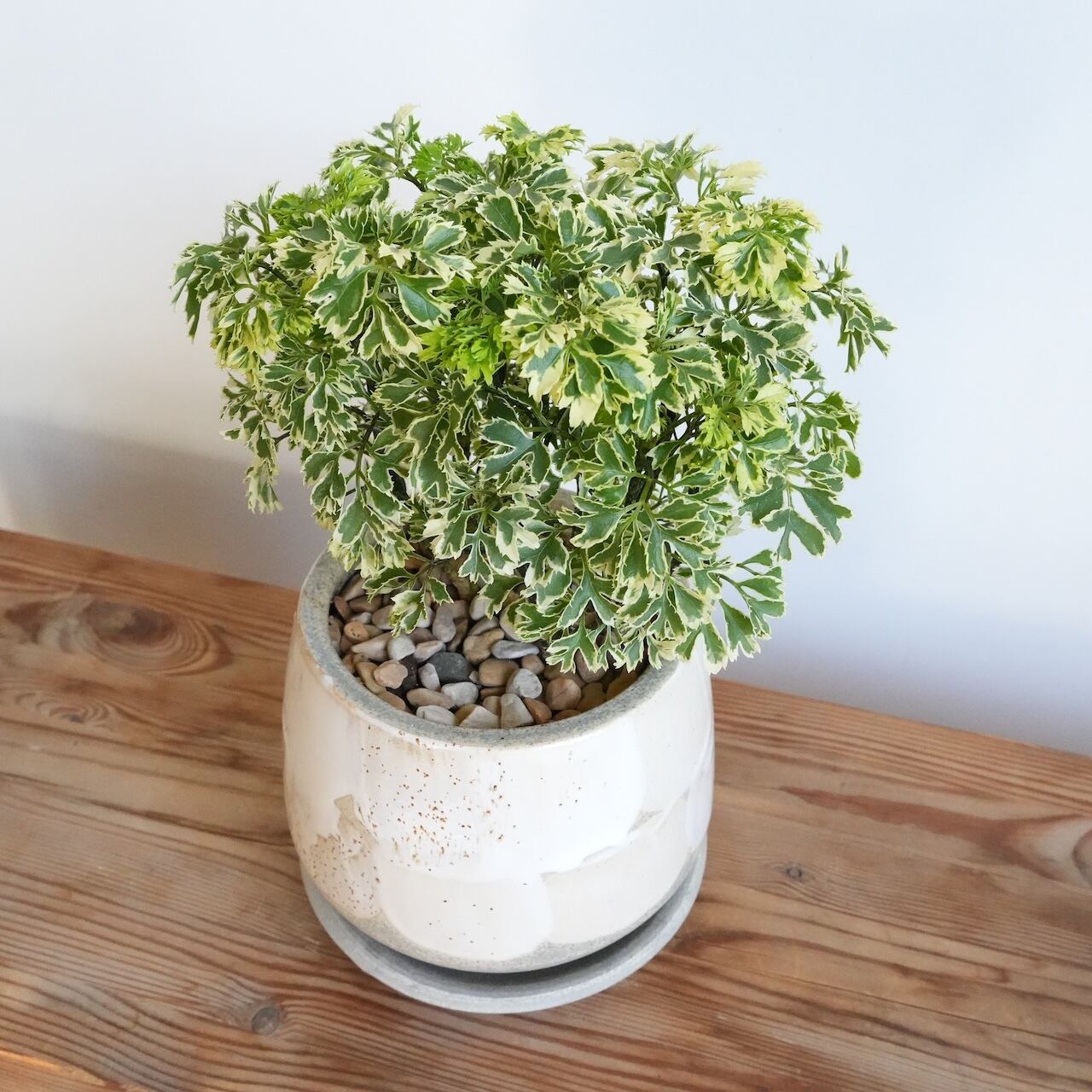 ご用意した「ポリシャス」はこんもりふわふわの草姿が愛らしいひと鉢。白で縁取られた斑入りの葉が軽やかで爽やかな印象です。