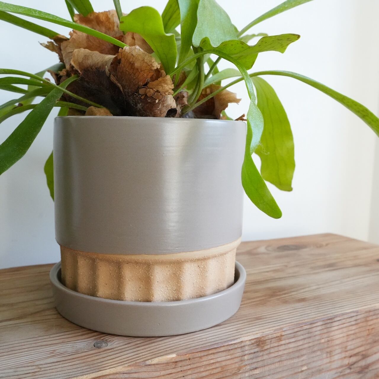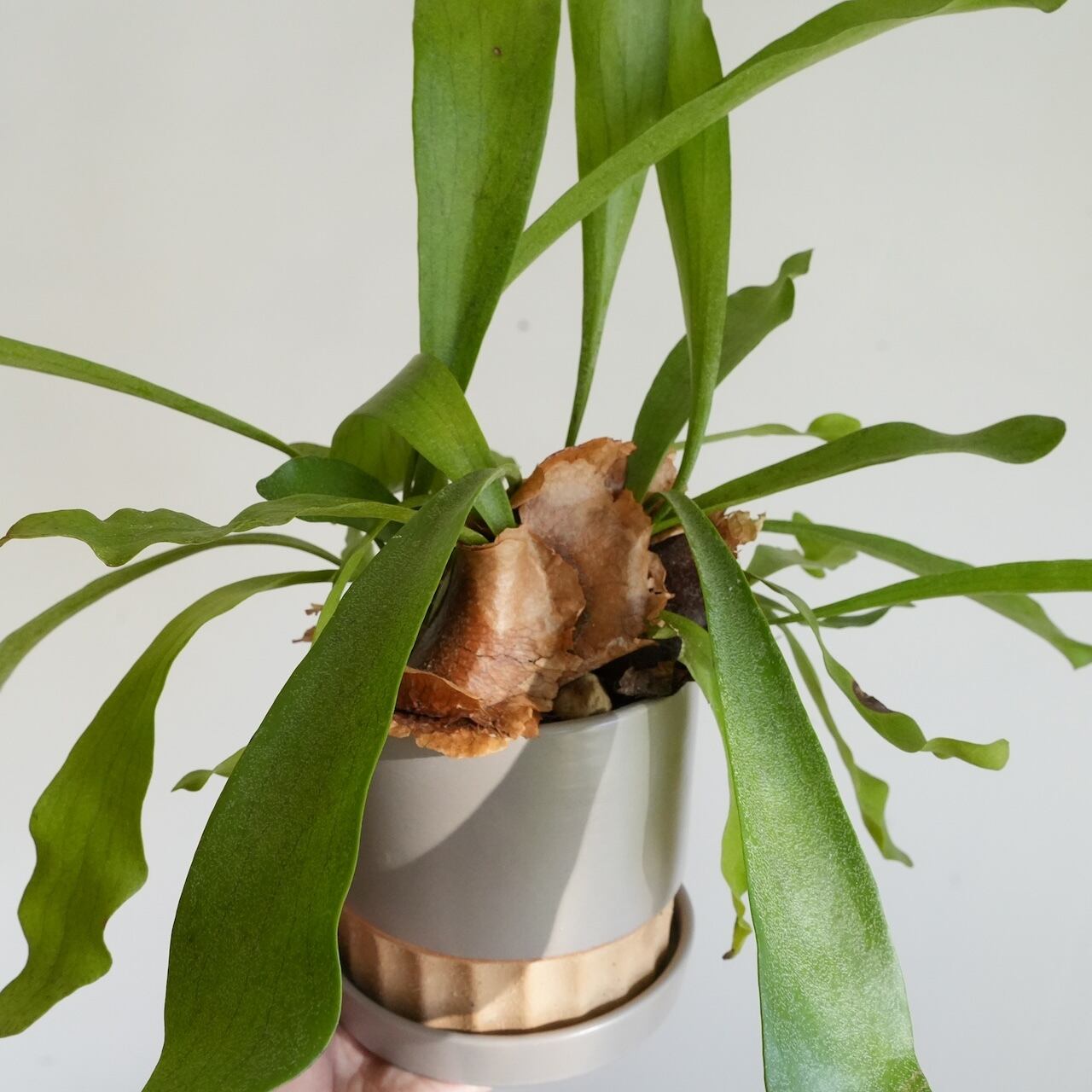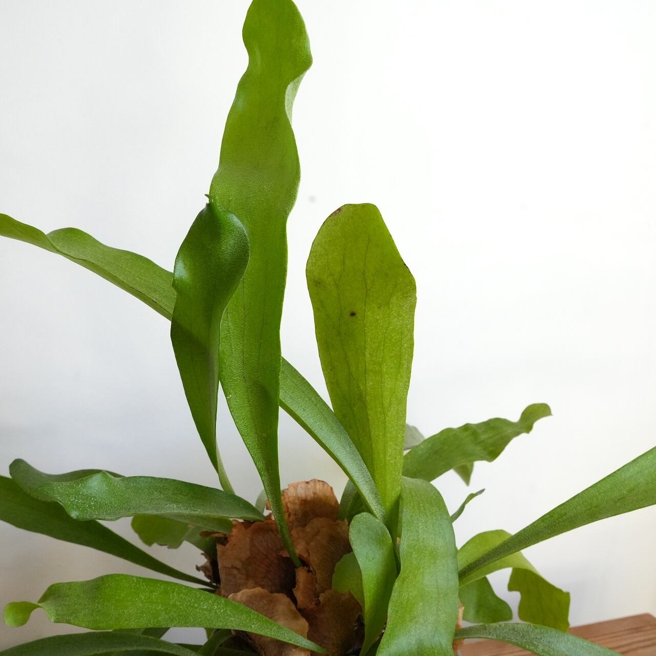ネザーランドはコウモリランの中でもメジャーで丈夫で育てやすい品種になります。コウモリランと言えば板付やハンギングで育てるイメージがありますが、ネザーランドは葉が垂れにくく上へ立ち上がりながら葉を伸ばす性質があるので鉢植えにも向いています。次第に貯水葉が鉢を包むように成長し野生味のある姿に変化していきます、