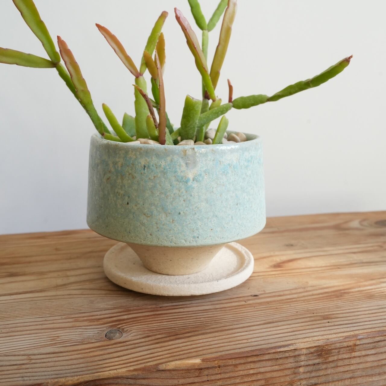 キラキラと光沢のあるパステルブルーのお椀型の陶器鉢に植え込み、土の上に白色の化粧石を敷いて仕上げました。