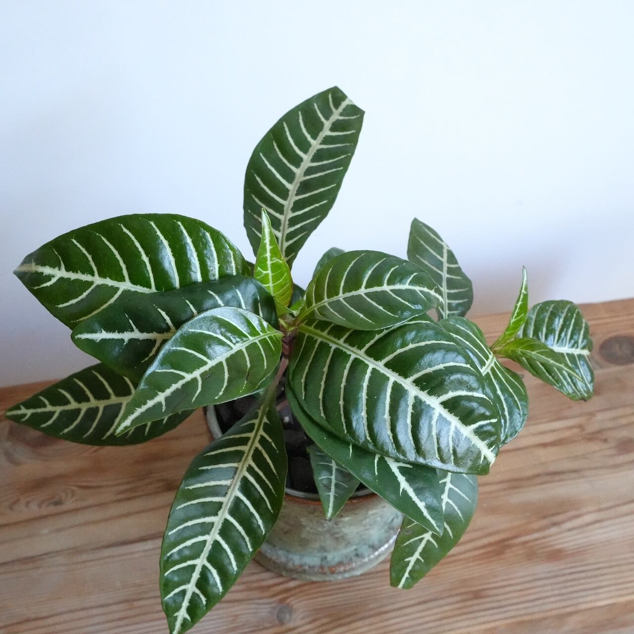 アフェランドラは約150種類以上あるとされている植物でトロピコはダニアの変種で濃いグリーンに白い葉脈がくっきりと入った葉が美しい品種です。やや大きめの葉に艶がありしっかりと存在感もあります。