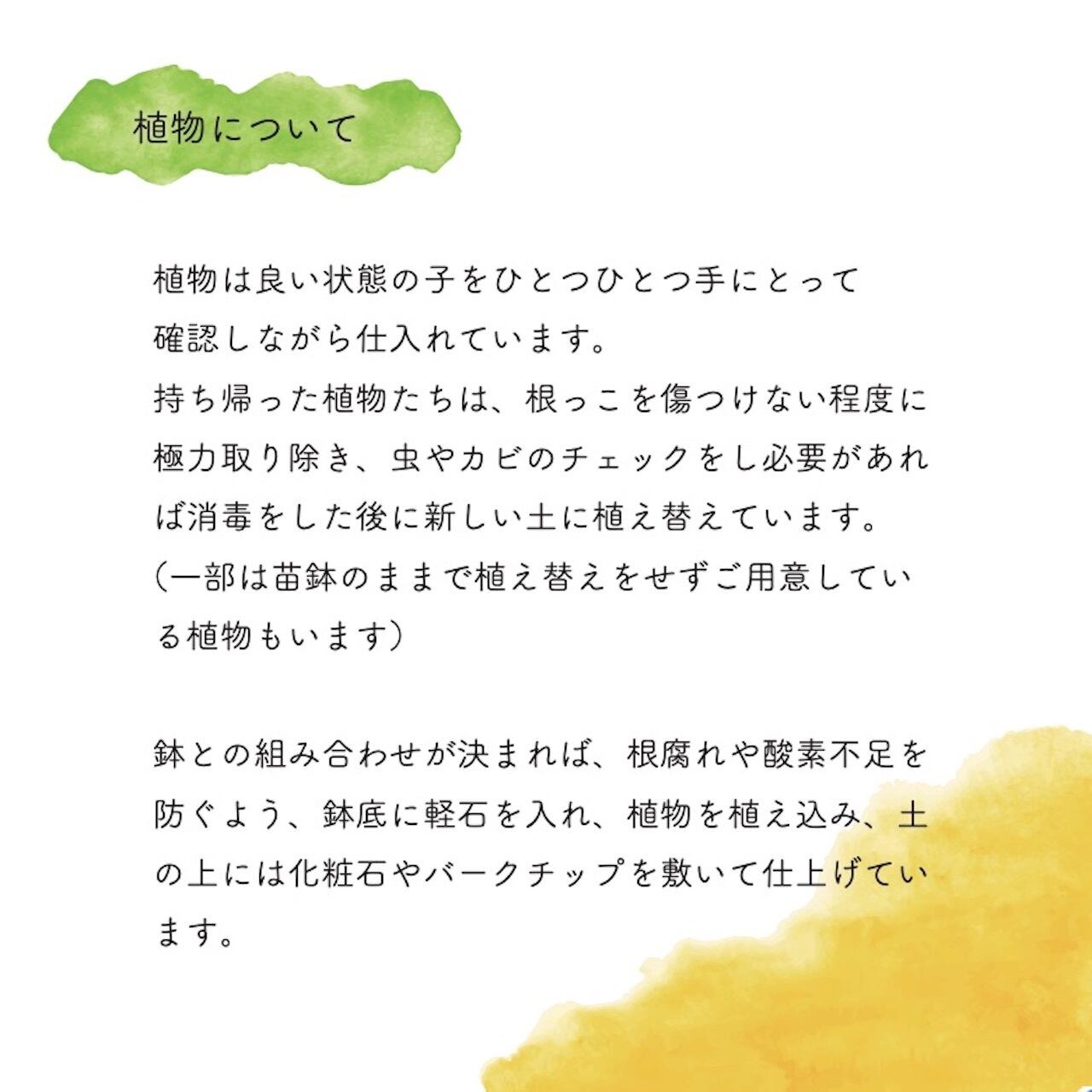 植物にとって配送はとても負担になってしまう為、可能な限り受け取りの出来るお日にちでお送りしています。また、大阪から配送日数のかかる地域への配送はお断りさせていただく場合がございますので、ご相談下さいませ。