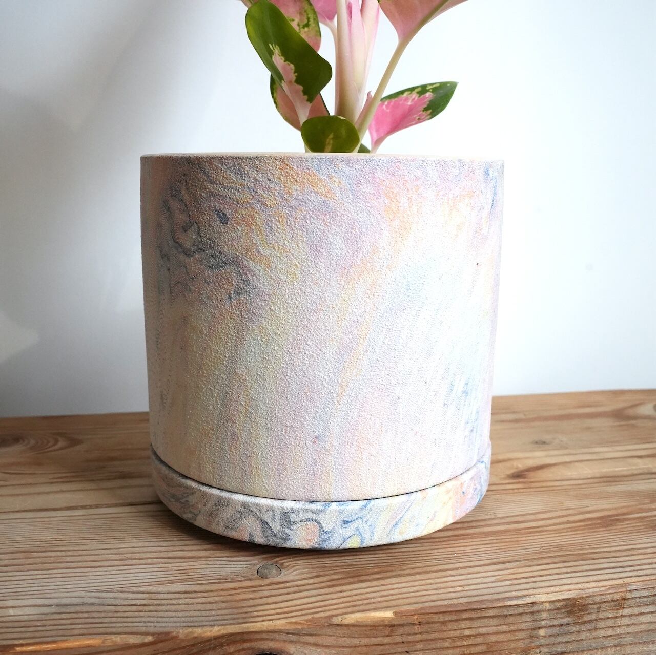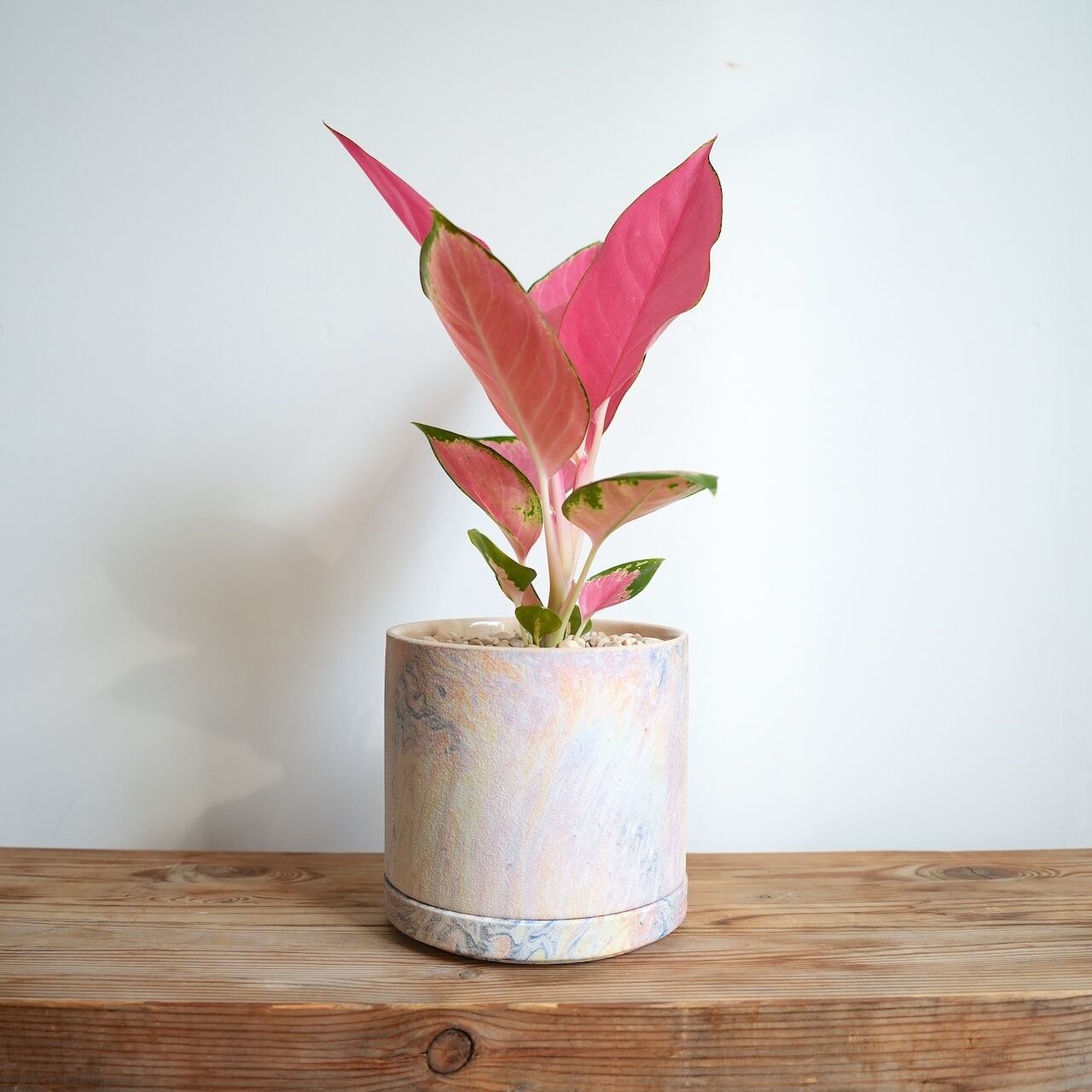 淡い色が混ざり合ったマーブルカラーのざらりとした質感の陶器鉢に植え込み、土の上に茶色の化粧石を敷いて仕上げました。