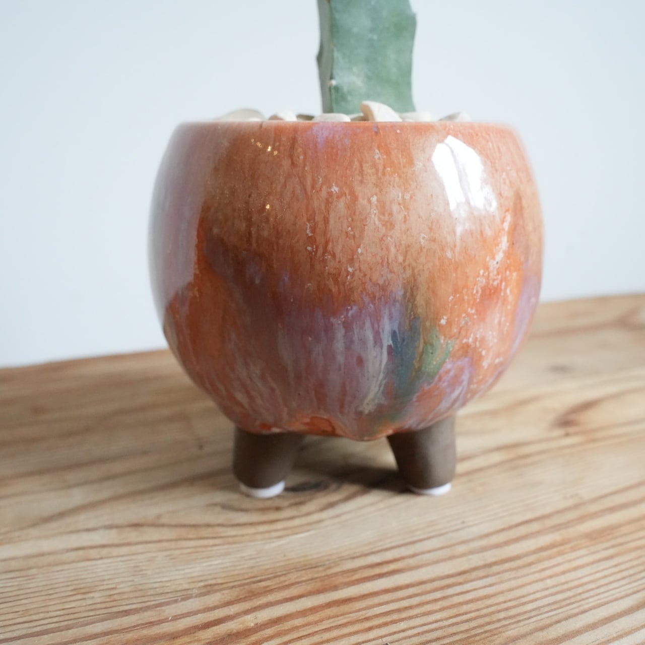 くすみオレンジベースの丸いフォルムが可愛い陶器鉢に植え込み、土の上にホワイトの化粧石を敷いて仕上げました。