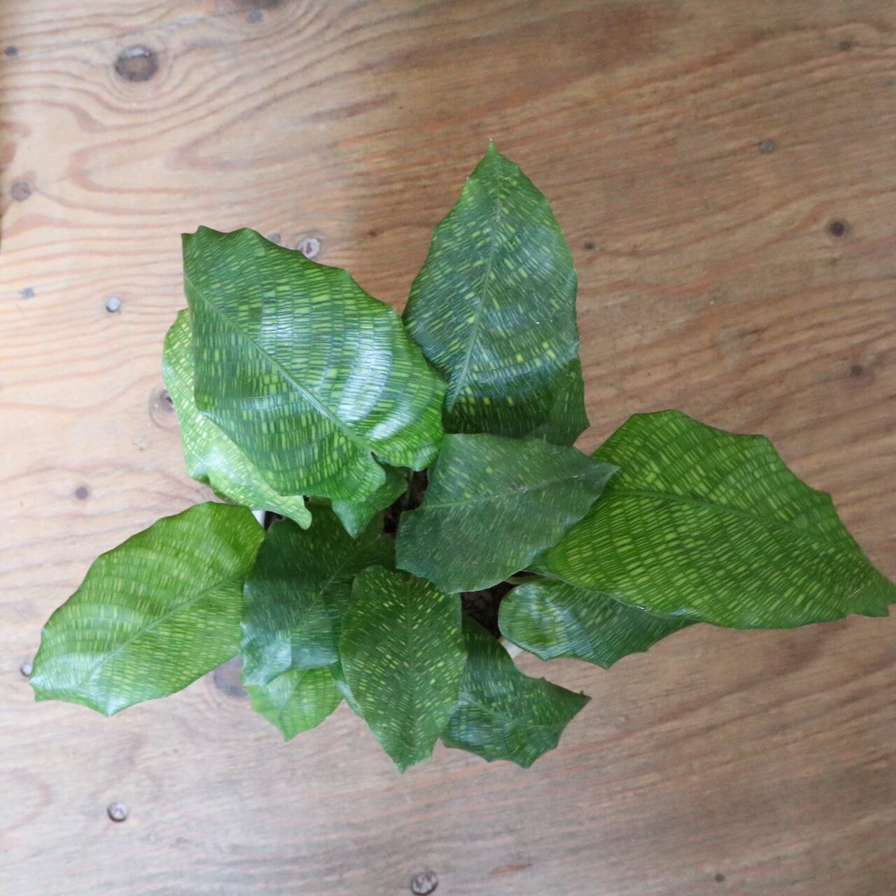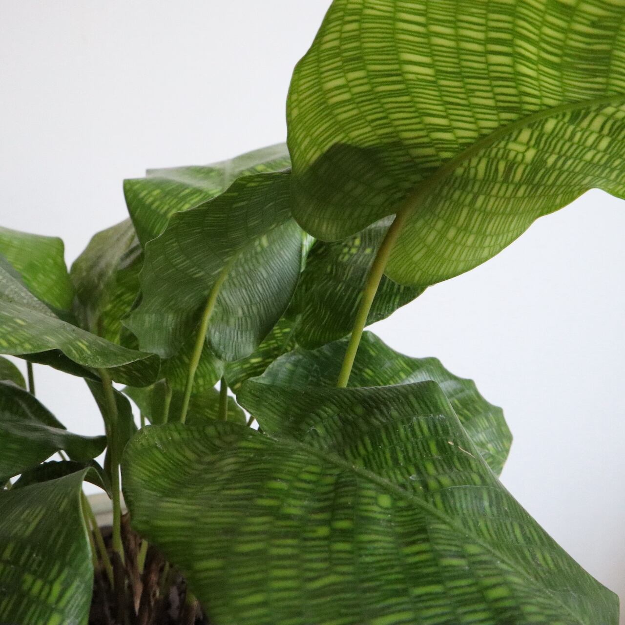 カラテアは約100種あるといわれており、葉の模様が美しい観葉植物です。ムサイカはモザイク模様の葉っぱが面白い品種になります。葉色はベーシックなグリーンの組み合わせで個性もありつつお部屋に馴染む爽やかな印象を持ちます。